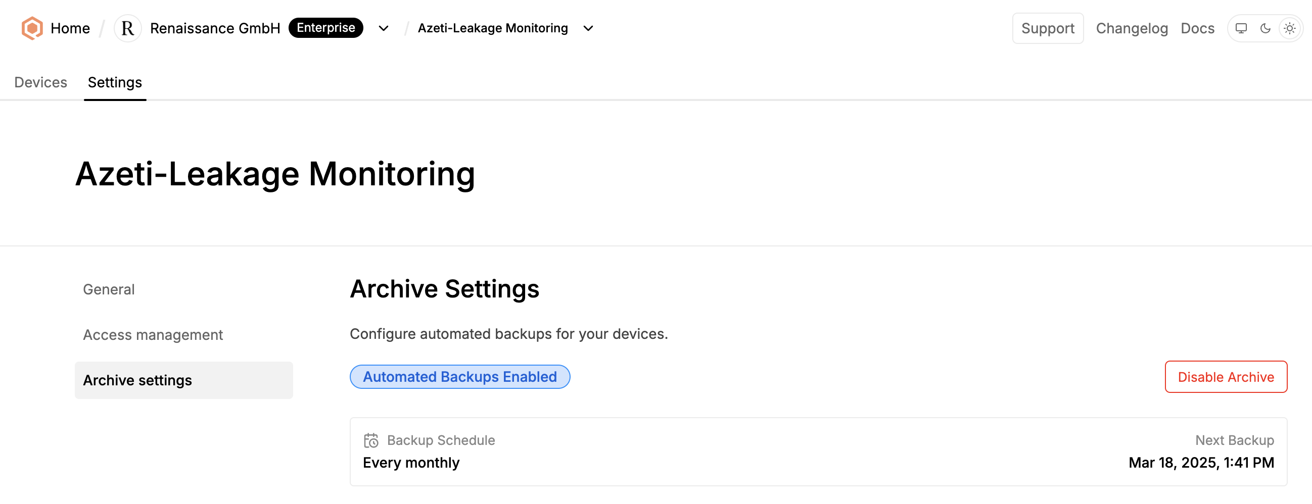 After enabling the archive, the **Archive Settings** page will display the configured schedule and the next backup time.