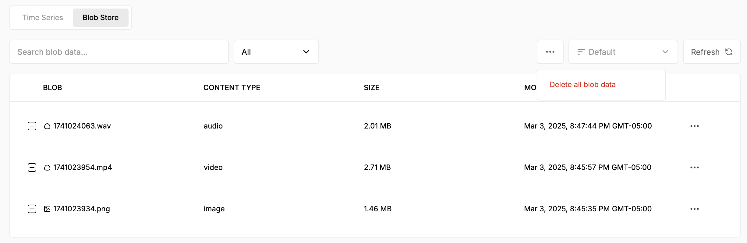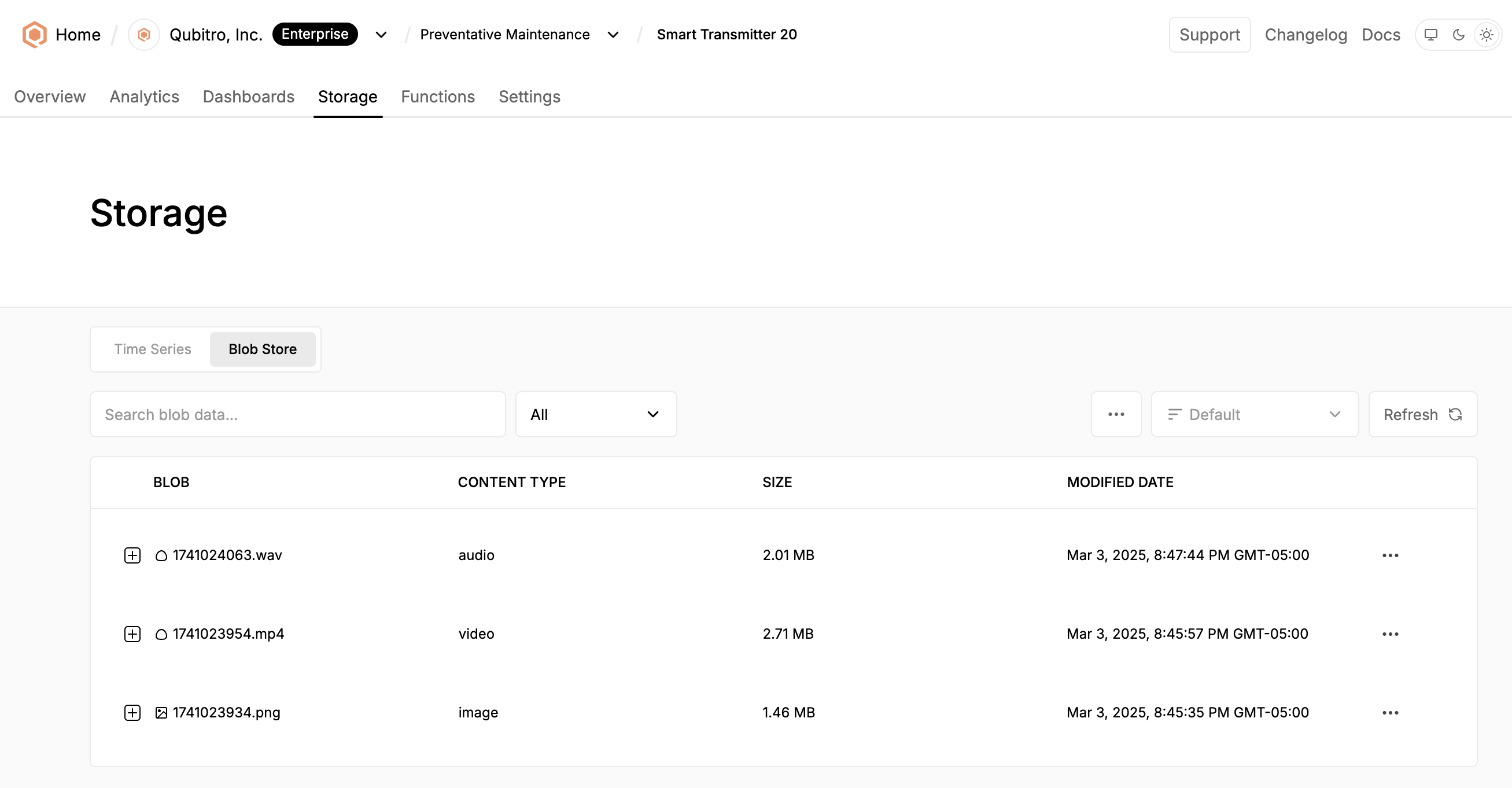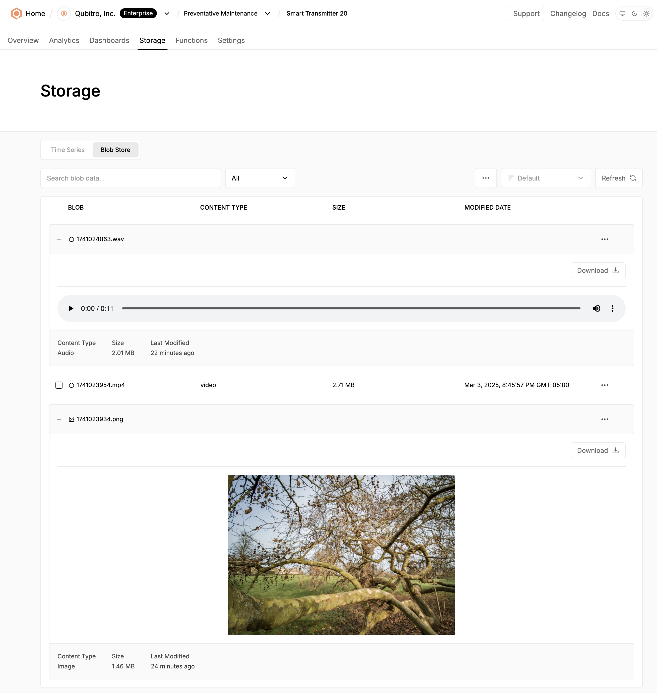 <figure><img src="https://3109056034-files.gitbook.io/~/files/v0/b/gitbook-x-prod.appspot.com/o/spaces%2FfQfo4zX1x0hfOimS9E2u%2Fuploads%2FFrg3WbFGtrArNaOlFEwr%2FCleanShot%202025-03-03%20at%2021.10.13%402x.png?alt=media&#x26;token=b4982872-bb9d-4f90-a2a6-036b9d1e519e" alt=""><figcaption><p>Qubitro Blob Store View</p></figcaption></figure>