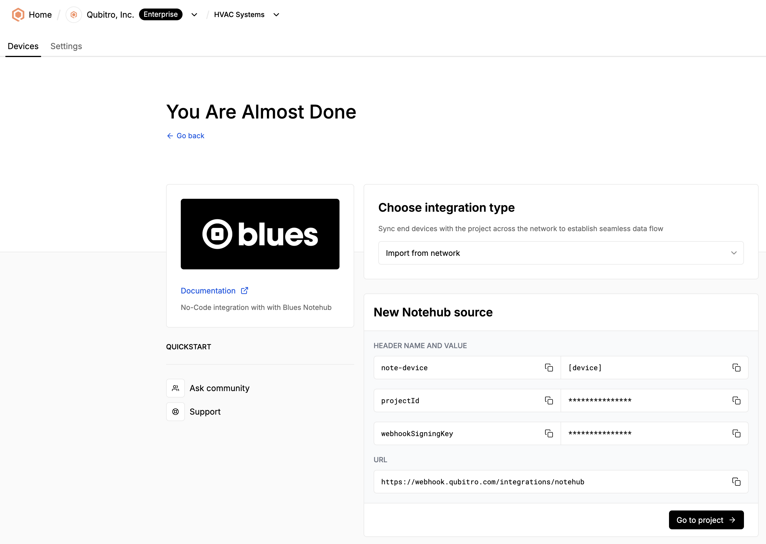 The Qubitro and Notehub—Blues cloud service integration allows you to sync all devices and their data from Notehub to Qubitro using [Notehub Routes](https://dev.blues.io/guides-and-tutorials/routing-data-to-cloud/general-http-https/)—without writing any code.