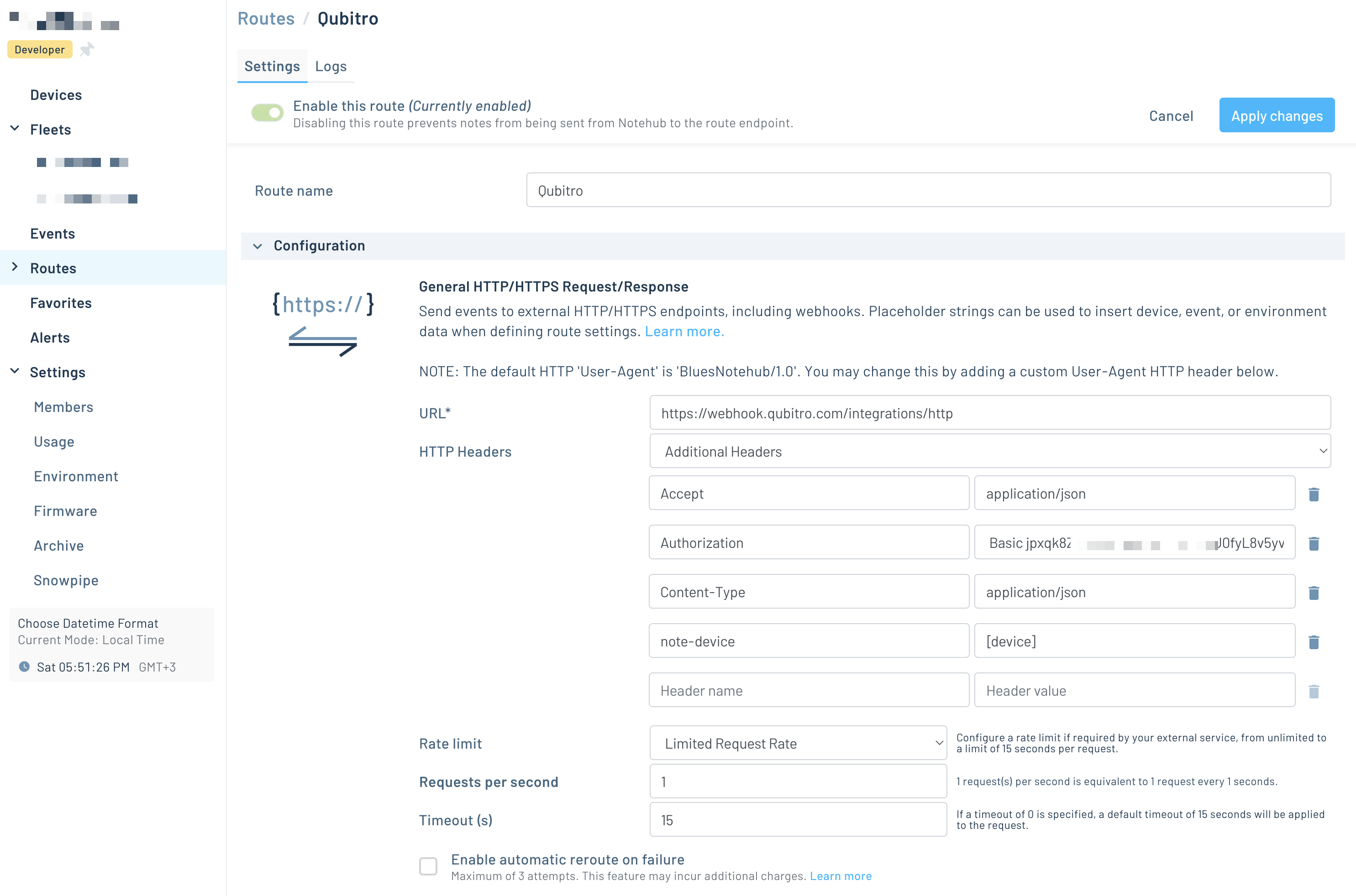 This integration **does not** **require** manual MQTT or HTTP forwarding from your device. Data flows directly between Notehub and Qubitro with no additional setup required on the device side.